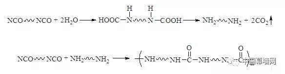 反應(yīng)型聚氨酯熱熔膠(PUR)固化過程分二個階段進(jìn)行,分別為冷卻凝聚和濕固化。在第一個階段,PUR與普通熱塑性熱熔膠一樣,膠黏劑加熱熔融,施膠于基材上后,冷卻凝聚產(chǎn)生初粘強(qiáng)度;在濕固化階段,PUR中的-NCO主要與空氣中的濕氣發(fā)生擴(kuò)鏈反應(yīng),其反應(yīng)原理如下式: