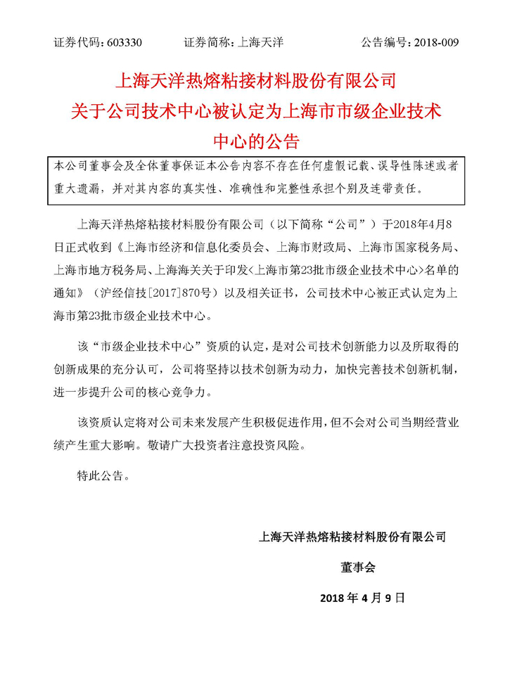 ?上海天洋熱熔粘接材料股份有限公司(以下簡(jiǎn)稱 “上海天洋集團(tuán) ” ) 于2018年4月8日 正式收到 《上海市經(jīng)濟(jì)和信息化委員會(huì)、 上海市財(cái)政局、 上海市國(guó)家稅務(wù)局、上海市地方稅務(wù)局、 上海海關(guān)關(guān)于印發(fā)<上海市第23批市級(jí)企業(yè)技術(shù)中心>名單的通知》(滬經(jīng)信技 [2017] 870號(hào)) 以及相關(guān)證書(shū),上海天洋集團(tuán)技術(shù)中心被正式認(rèn)定為上海市第23批市級(jí)企業(yè)技術(shù)中心。